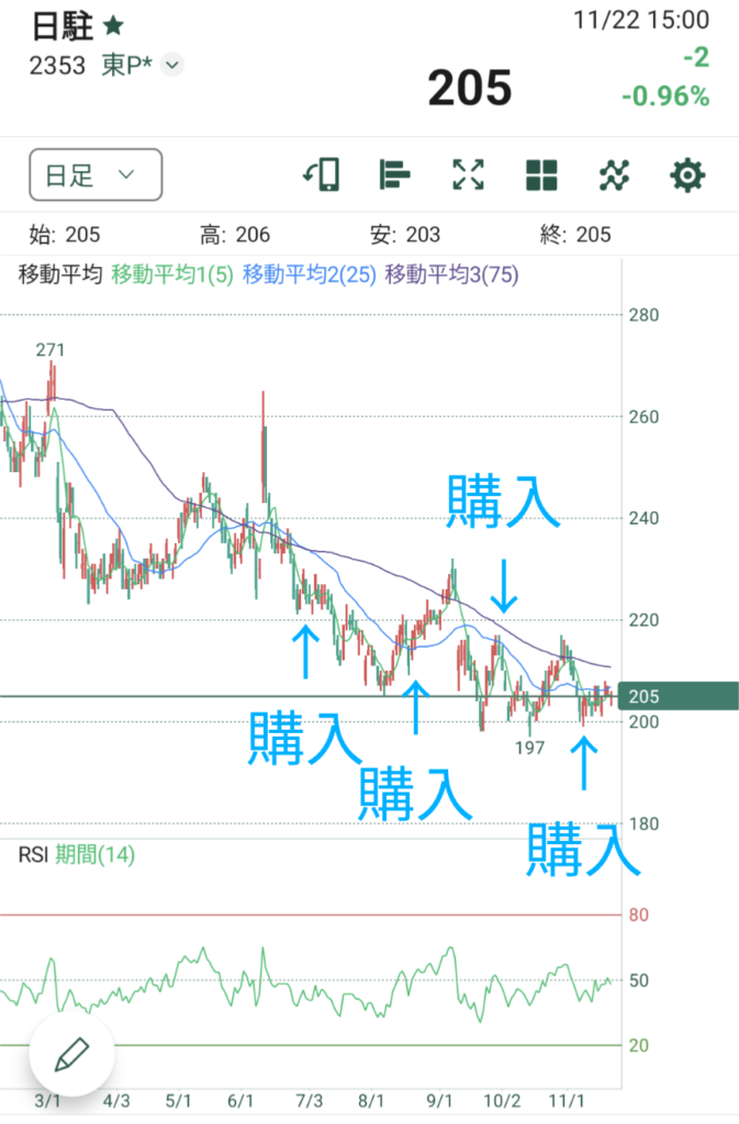 200円前後で下値を固めていますので、これを下回ったら損切り、決算で上昇トレンドになったら持っていようと思います。