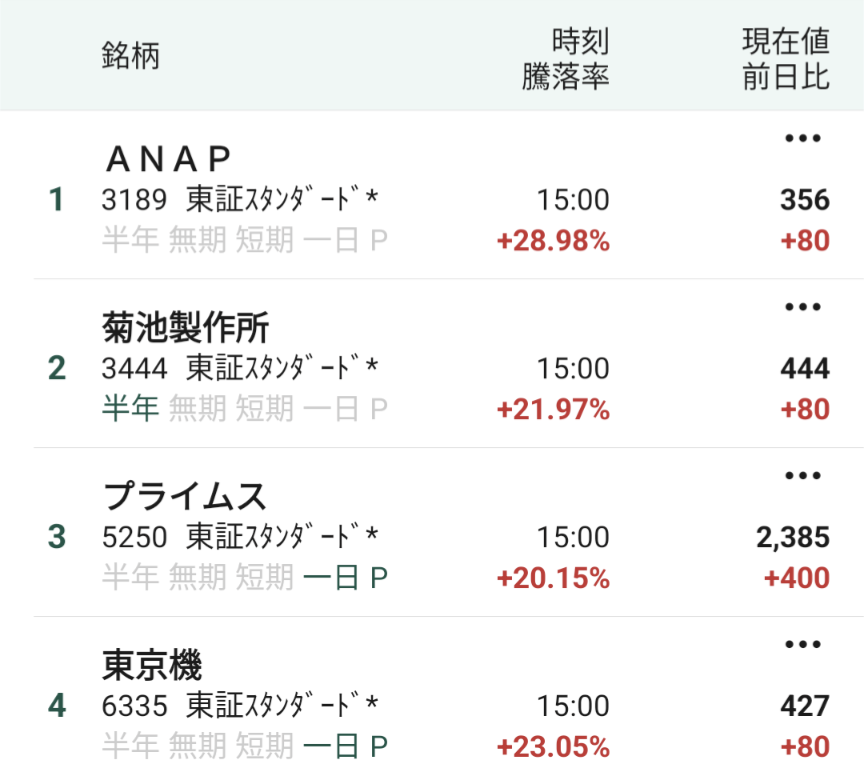 金曜日のストップ高一覧です。